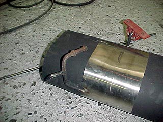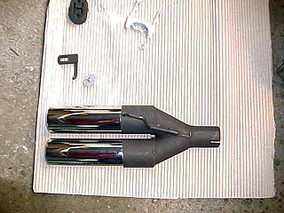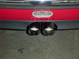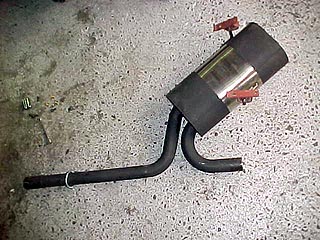 | こちら本体です。 一度、ノーマルマフラーの位置に行って Uターンをしてくる構造です。 もちろん、スペアタイヤは下ろします。 ならば、真中太鼓では、なぜイカン!!??(^^;;; |